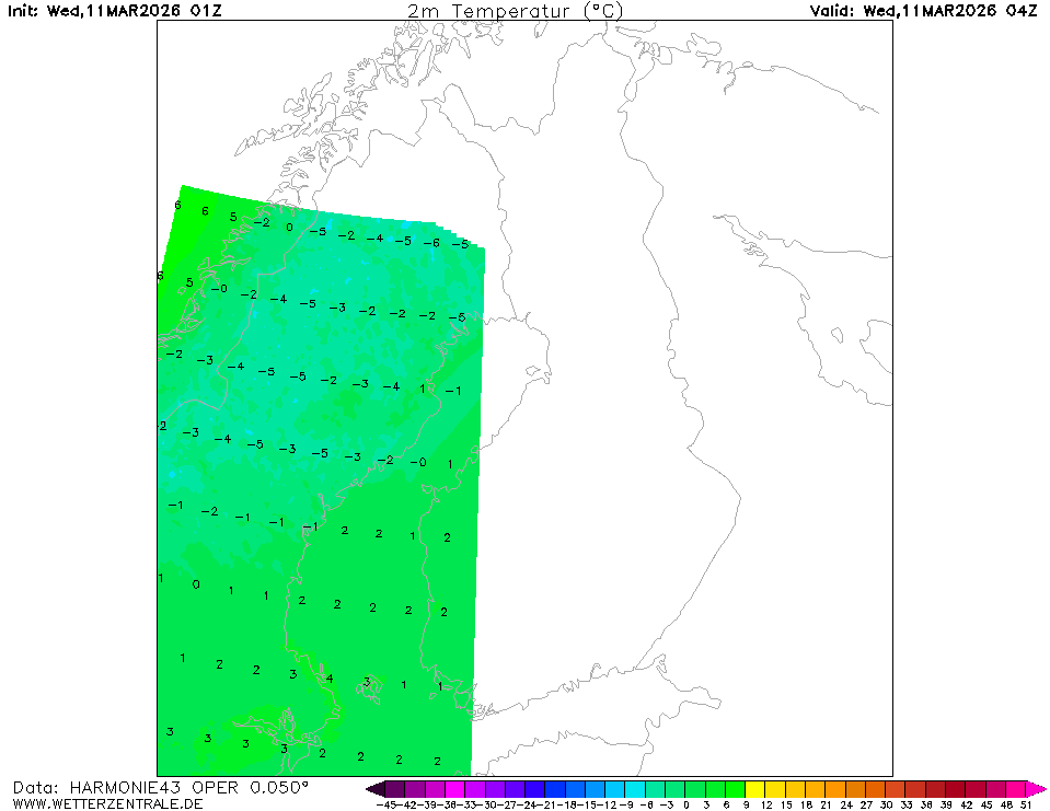 HARMONIE (FMI)The selected variable and region is available, but not for 2025-12-10, 04:00. You will switch back to the first available time step. HARMONIE is a mesoscale weather prediction model managed by the Finnish Meteorological Institute. The data is updated 4 times a day at 00, 06, 12 and 18 UTC. Corresponding model runs are available roughly five hours after analysis time (~ after model run has started).