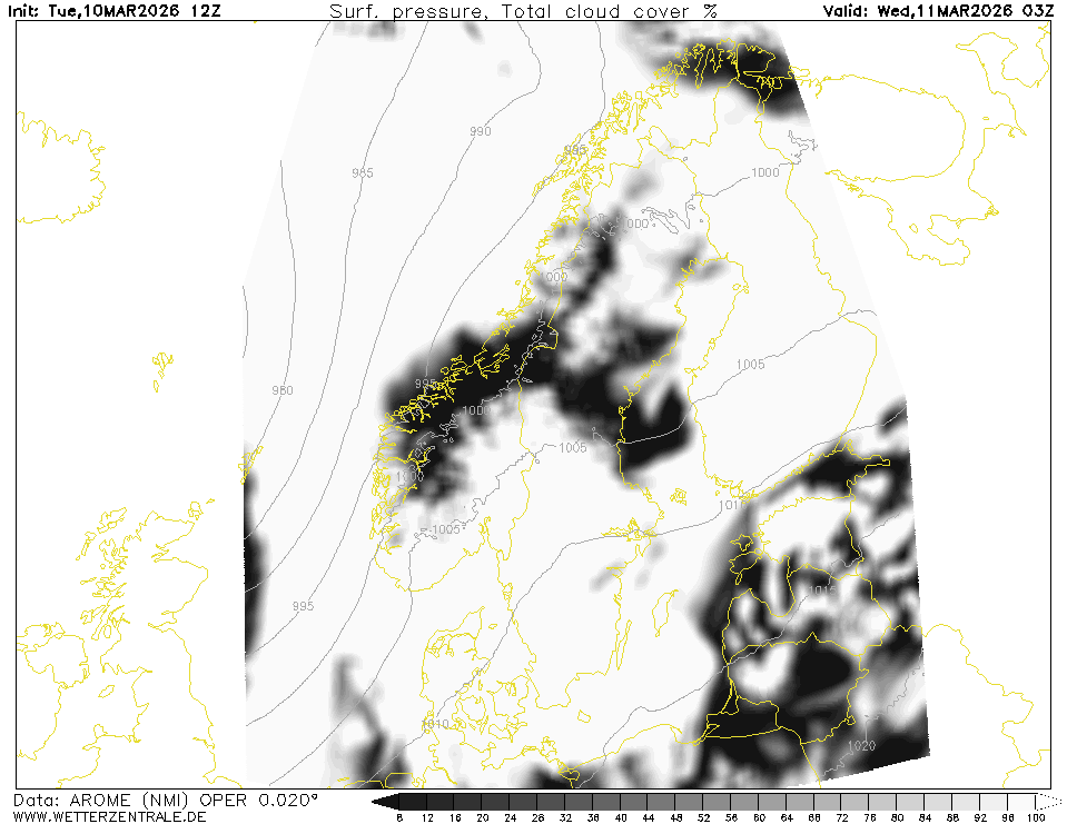 HARMONIE (KNMI-EU)The selected time, variable and region is available for this model. HARMONIE is developed in a european consortium and this is the output provided by the KNMI at the supercomputing facilities in Iceland. The output from Cy43 is available at a rotated lat-lon grid and regridded at our server to a grid spacing of 0.05 degree. These data are the raw data provided by the KNMI. The model is reinitialized every hour and run up to 60 hrs ahead.
