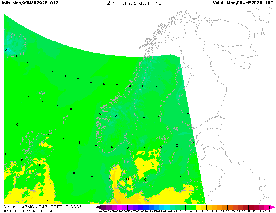 HARMONIE (FMI)The selected time, variable and region is available for this model. HARMONIE is a mesoscale weather prediction model managed by the Finnish Meteorological Institute. The data is updated 4 times a day at 00, 06, 12 and 18 UTC. Corresponding model runs are available roughly five hours after analysis time (~ after model run has started).