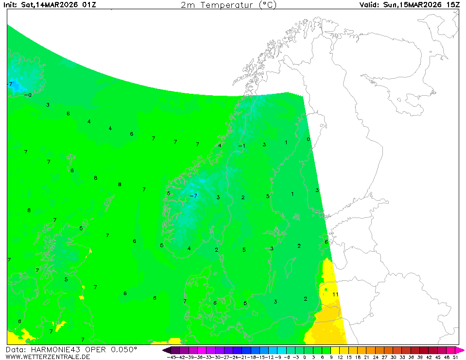 HARMONIE (FMI)The selected variable and region is available, but not for 2026-02-11, 15:00. You will switch back to the first available time step. HARMONIE is a mesoscale weather prediction model managed by the Finnish Meteorological Institute. The data is updated 4 times a day at 00, 06, 12 and 18 UTC. Corresponding model runs are available roughly five hours after analysis time (~ after model run has started).
