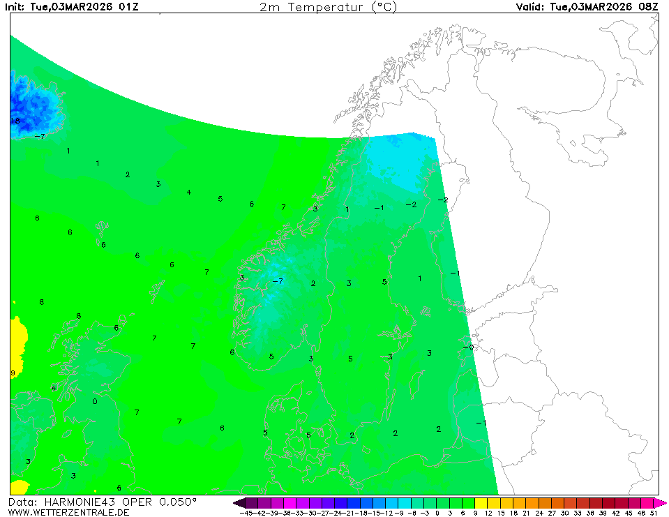 HARMONIE (FMI)The selected variable and region is available, but not for 2025-12-16, 08:00. You will switch back to the first available time step. HARMONIE is a mesoscale weather prediction model managed by the Finnish Meteorological Institute. The data is updated 4 times a day at 00, 06, 12 and 18 UTC. Corresponding model runs are available roughly five hours after analysis time (~ after model run has started).