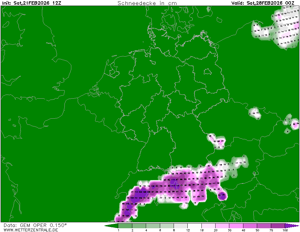 ICONDie ausgewählte Zeit, Parameter und Region ist für dieses Modell verfügbar. ICON ist das globale Wettervorhersagemodell des Deutschen Wetterdienstes (DWD). Vorhersagen bis zu 120 Stunden sind verfügbar. Horizontale Auflösung 13 bzw. 6 km, 90 Modellflächen mit Oberrand in 75 km, der Output am regulären Gitter erfolgt derzeit auf 0.125° global und 0.062° für Europa. Die Karten werden 4 mal am Tag aktualisiert (4:15,10:15, 16:15 und 22:15 UTC).