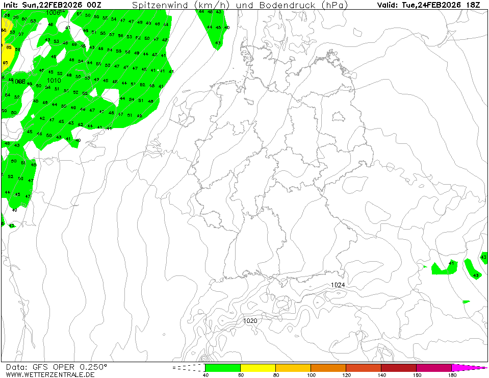 ICONDie ausgewählte Zeit, Parameter und Region ist für dieses Modell verfügbar. ICON ist das globale Wettervorhersagemodell des Deutschen Wetterdienstes (DWD). Vorhersagen bis zu 120 Stunden sind verfügbar. Horizontale Auflösung 13 bzw. 6 km, 90 Modellflächen mit Oberrand in 75 km, der Output am regulären Gitter erfolgt derzeit auf 0.125° global und 0.062° für Europa. Die Karten werden 4 mal am Tag aktualisiert (4:15,10:15, 16:15 und 22:15 UTC).