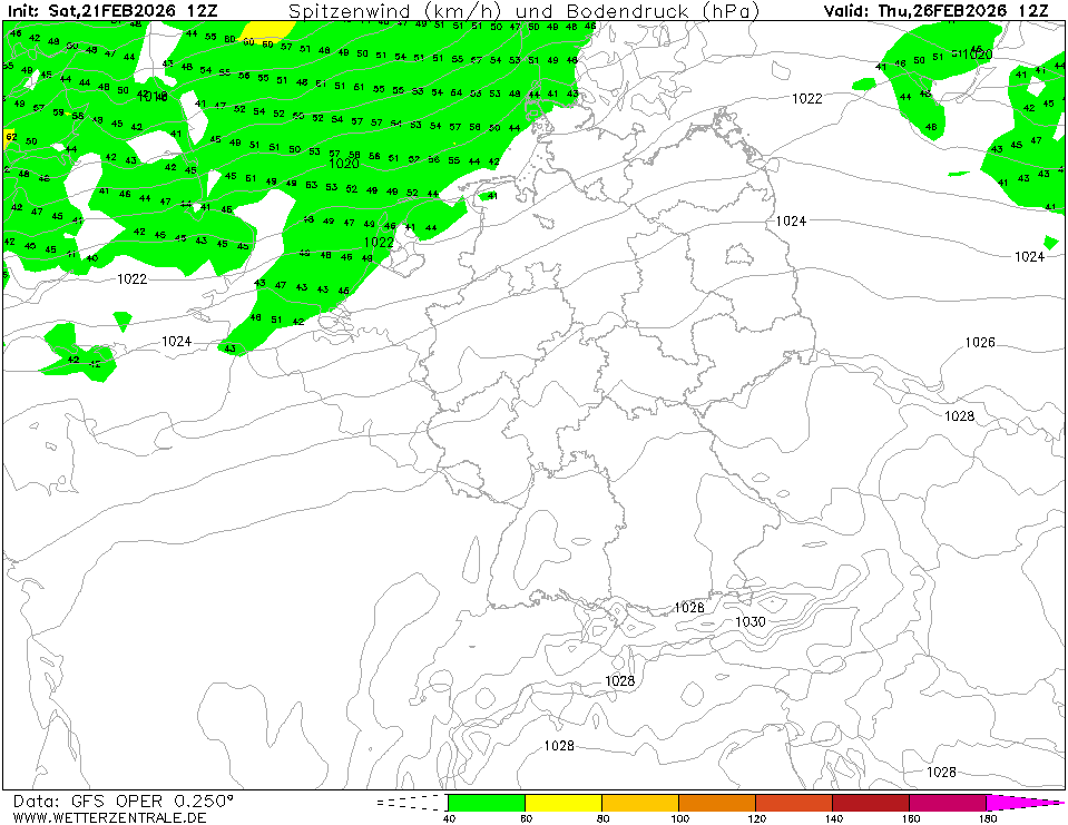 ICONDie ausgewählte Zeit, Parameter und Region ist für dieses Modell verfügbar. ICON ist das globale Wettervorhersagemodell des Deutschen Wetterdienstes (DWD). Vorhersagen bis zu 120 Stunden sind verfügbar. Horizontale Auflösung 13 bzw. 6 km, 90 Modellflächen mit Oberrand in 75 km, der Output am regulären Gitter erfolgt derzeit auf 0.125° global und 0.062° für Europa. Die Karten werden 4 mal am Tag aktualisiert (4:15,10:15, 16:15 und 22:15 UTC).