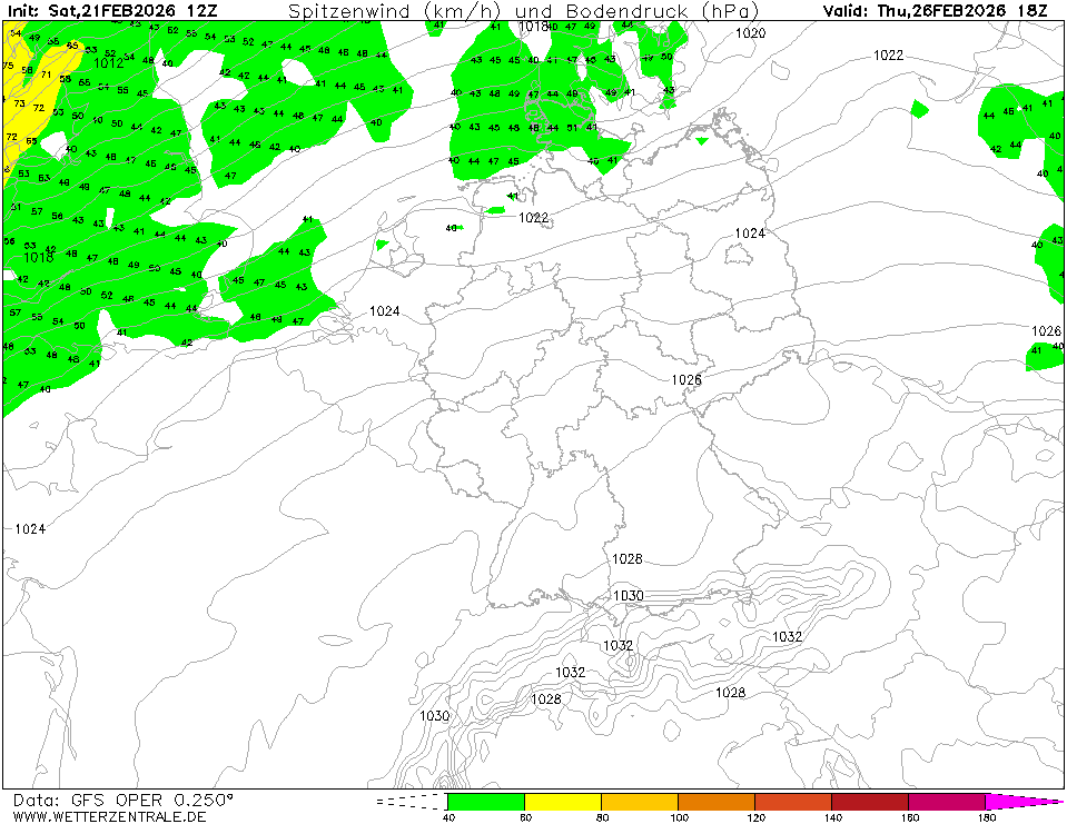 ICONDie ausgewählte Zeit, Parameter und Region ist für dieses Modell verfügbar. ICON ist das globale Wettervorhersagemodell des Deutschen Wetterdienstes (DWD). Vorhersagen bis zu 120 Stunden sind verfügbar. Horizontale Auflösung 13 bzw. 6 km, 90 Modellflächen mit Oberrand in 75 km, der Output am regulären Gitter erfolgt derzeit auf 0.125° global und 0.062° für Europa. Die Karten werden 4 mal am Tag aktualisiert (4:15,10:15, 16:15 und 22:15 UTC).