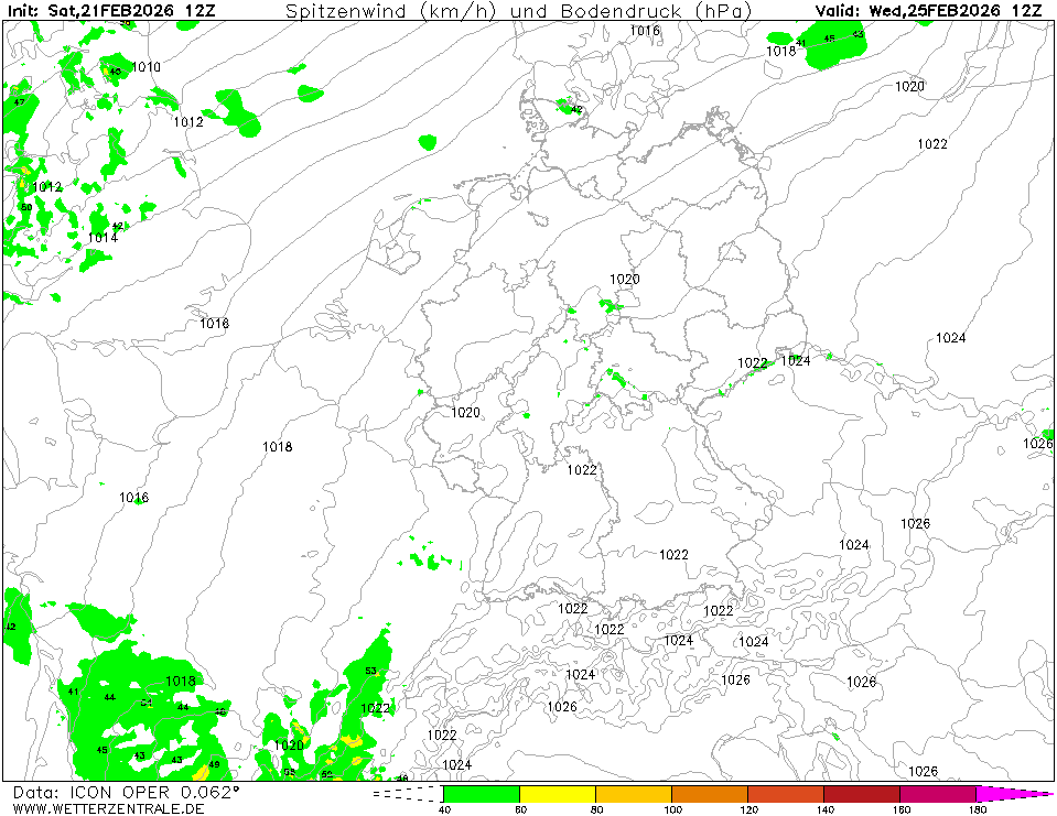 ICONJetzt ausgewählt. ICON ist das globale Wettervorhersagemodell des Deutschen Wetterdienstes (DWD). Vorhersagen bis zu 120 Stunden sind verfügbar. Horizontale Auflösung 13 bzw. 6 km, 90 Modellflächen mit Oberrand in 75 km, der Output am regulären Gitter erfolgt derzeit auf 0.125° global und 0.062° für Europa. Die Karten werden 4 mal am Tag aktualisiert (4:15,10:15, 16:15 und 22:15 UTC).