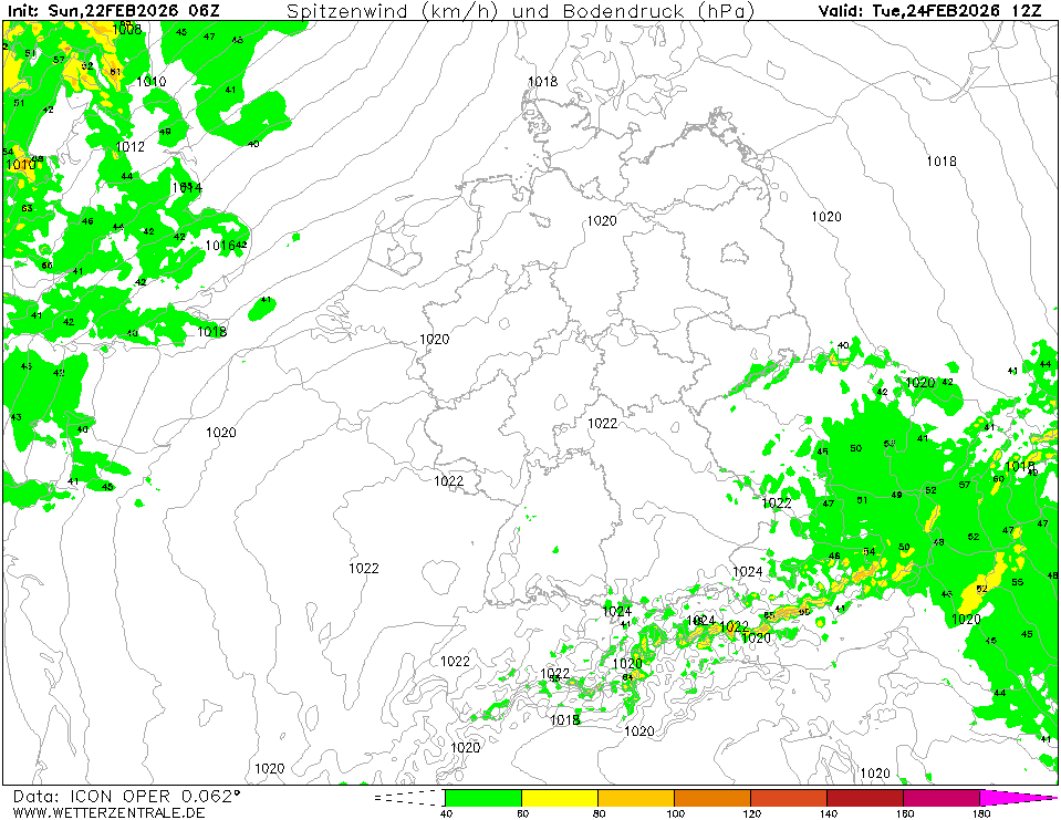 ICONJetzt ausgewählt. ICON ist das globale Wettervorhersagemodell des Deutschen Wetterdienstes (DWD). Vorhersagen bis zu 120 Stunden sind verfügbar. Horizontale Auflösung 13 bzw. 6 km, 90 Modellflächen mit Oberrand in 75 km, der Output am regulären Gitter erfolgt derzeit auf 0.125° global und 0.062° für Europa. Die Karten werden 4 mal am Tag aktualisiert (4:15,10:15, 16:15 und 22:15 UTC).