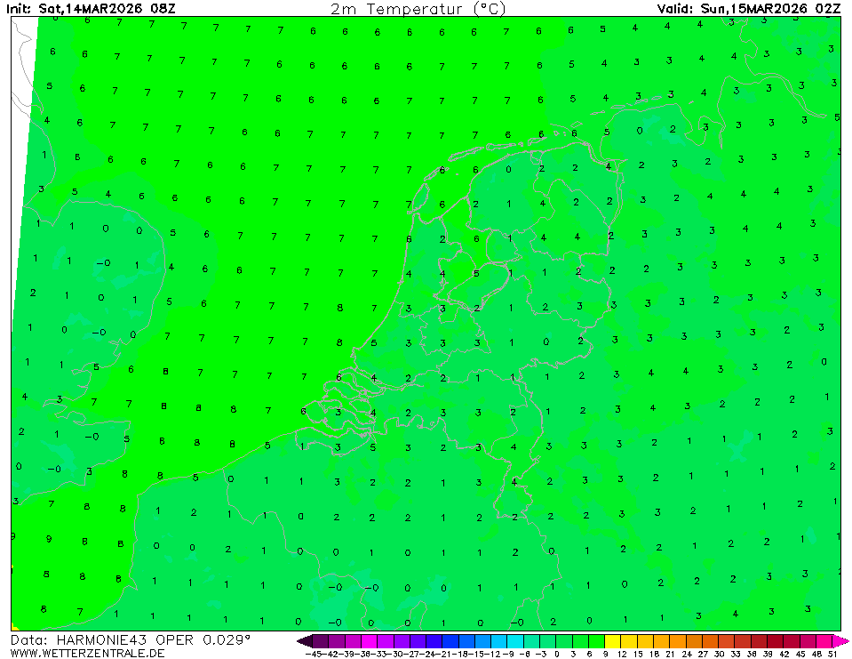 HARMONIE (KNMI-NL)Actuele selectie. HARMONIE is ontwikkeld in een Europees consortium en dit is de output van het KNMI bij de supercomputerfaciliteiten in IJsland. De uitvoer van Cy43 is beschikbaar op een rasterafstand van 0,029 graden. Deze gegevens zijn de ruwe gegevens van het KNMI. Het model wordt elk uur opnieuw geïnitialiseerd en loopt tot 60 uur vooruit.