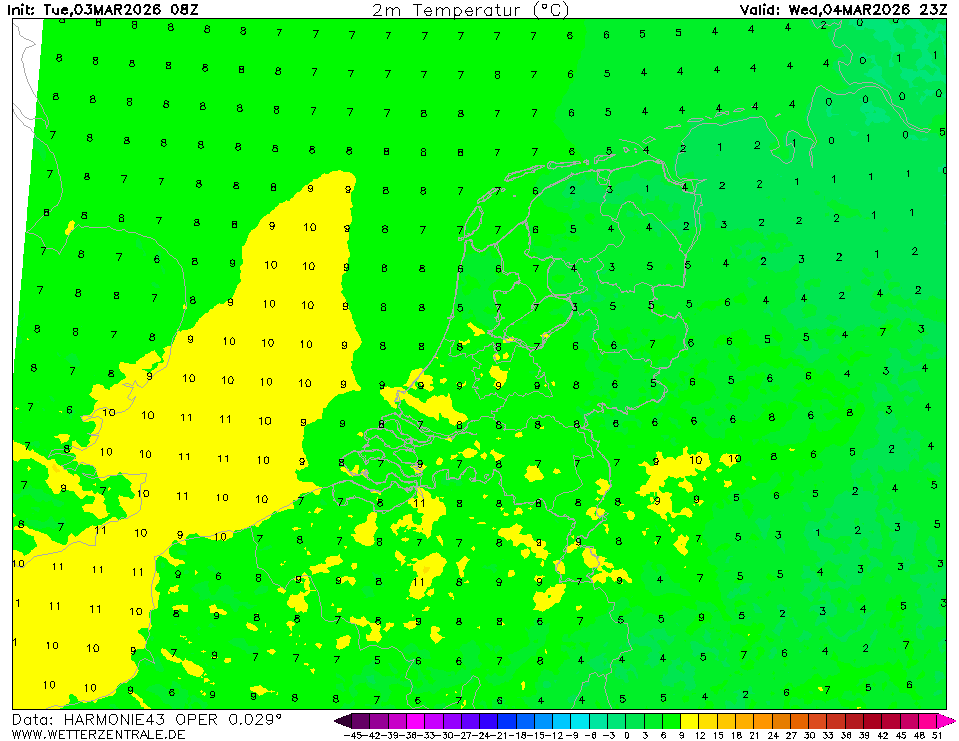 HARMONIE (KNMI-NL)Actuele selectie. HARMONIE is ontwikkeld in een Europees consortium en dit is de output van het KNMI bij de supercomputerfaciliteiten in IJsland. De uitvoer van Cy43 is beschikbaar op een rasterafstand van 0,029 graden. Deze gegevens zijn de ruwe gegevens van het KNMI. Het model wordt elk uur opnieuw geïnitialiseerd en loopt tot 60 uur vooruit.
