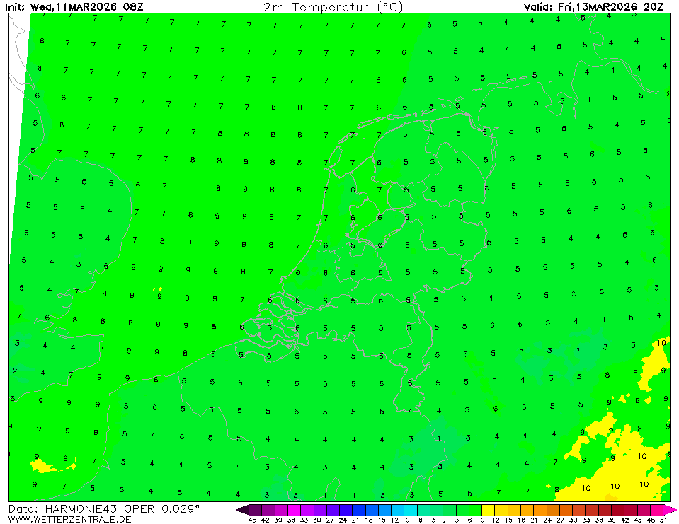 HARMONIE (KNMI-NL)Actuele selectie. HARMONIE is ontwikkeld in een Europees consortium en dit is de output van het KNMI bij de supercomputerfaciliteiten in IJsland. De uitvoer van Cy43 is beschikbaar op een rasterafstand van 0,029 graden. Deze gegevens zijn de ruwe gegevens van het KNMI. Het model wordt elk uur opnieuw geïnitialiseerd en loopt tot 60 uur vooruit.