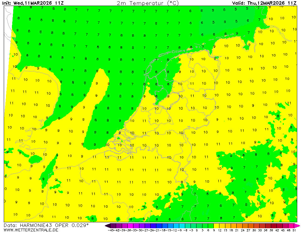HARMONIE (KNMI-NL)Actuele selectie. HARMONIE is ontwikkeld in een Europees consortium en dit is de output van het KNMI bij de supercomputerfaciliteiten in IJsland. De uitvoer van Cy43 is beschikbaar op een rasterafstand van 0,029 graden. Deze gegevens zijn de ruwe gegevens van het KNMI. Het model wordt elk uur opnieuw geïnitialiseerd en loopt tot 60 uur vooruit.
