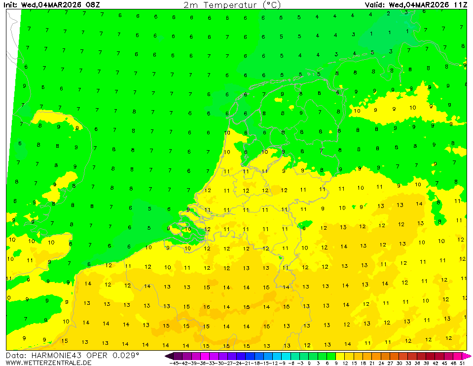 HARMONIE (KNMI-NL)Actuele selectie. HARMONIE is ontwikkeld in een Europees consortium en dit is de output van het KNMI bij de supercomputerfaciliteiten in IJsland. De uitvoer van Cy43 is beschikbaar op een rasterafstand van 0,029 graden. Deze gegevens zijn de ruwe gegevens van het KNMI. Het model wordt elk uur opnieuw geïnitialiseerd en loopt tot 60 uur vooruit.