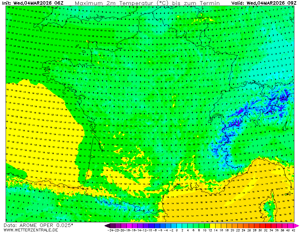 AROMEActuele selectie. AROME is een mesoschaal model, dat wordt gebruikt door diverse weerinstituten, o.a. de Franse en Noorse weerdienst. De Franse voorspelling hebben 2.5 km resolutie en zijn beschikbaar tot 42 uur vooruit voor de 0 en 12 UTC runs en tot 36 uur voor de overige runs.