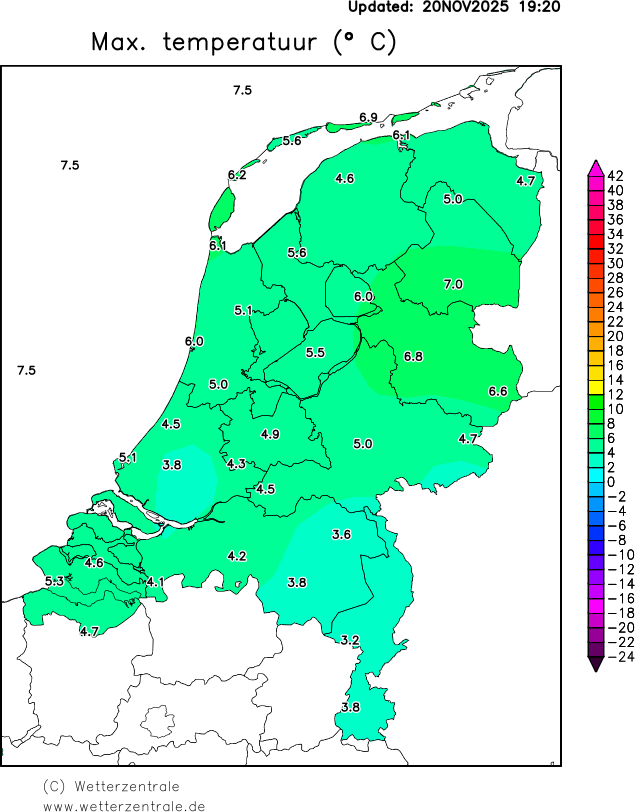 De Nederlandse weergegevens zijn afkomstig van het Koninklijk Nederlands Meteorologisch Instituut (KNMI). Klik hier voor meer informatie over deze gegevens. De gegevens worden dagelijks om 9:00 geupdate. De neerslag en sneeuwkaarten komen pas na enkele weken beschikbaar, omdat het KNMI deze gegevens eerst valideert.